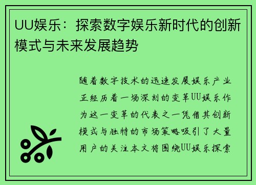 文章摘要:四喜娱乐作为一家新兴的娱乐公司,凭借其创新的商业模式和技术优势,已经在行业中崭露头角。本文将从四喜娱乐如何通过创新模式引领行业变革、应对未来发展趋势的角度,进行深度解析。文章将从四个方面详细阐述:首先,四喜娱乐在创新模式上的突破,如何改变传统娱乐行业的商业结构;其次,四喜娱乐如何借助科技的...